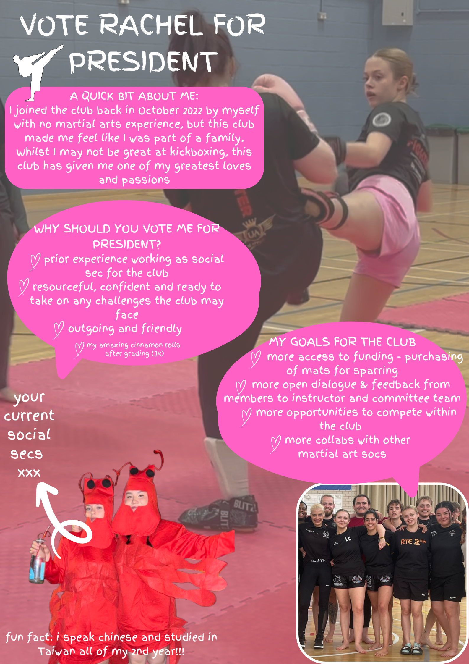 PRESIDENT- MUST have one years’ experience on any committee. President of Kickboxing and Krav Maga, responsible for the overall running and maintenance of the society and it's members. Head of the committee.