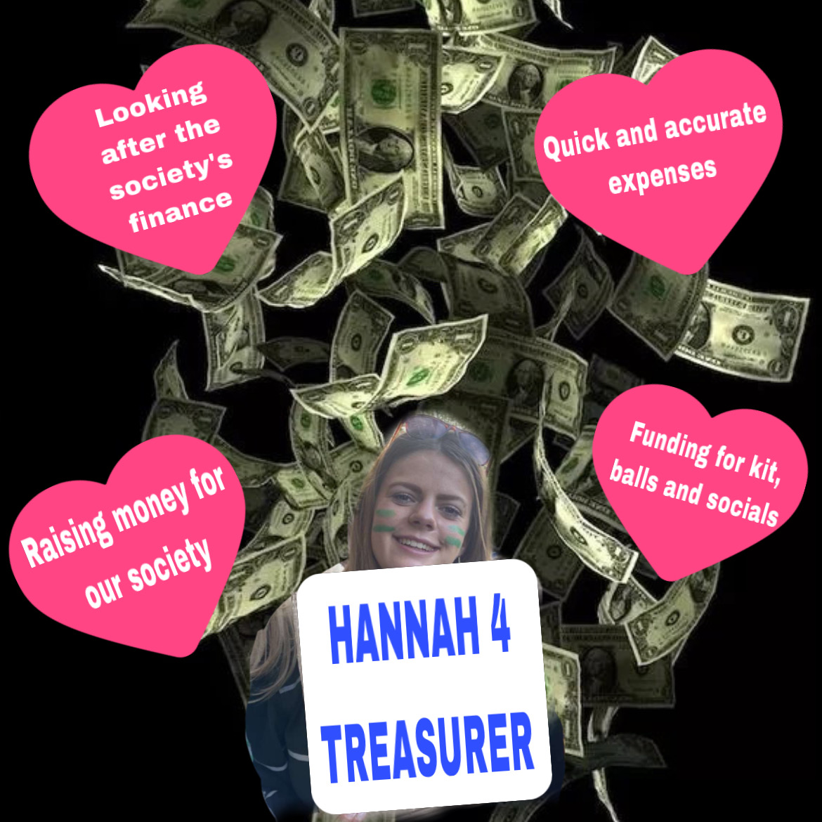 The treasurer forms part of the ‘big three’ (President, Secretary and Treasurer) who all work closely together across the year! This is a really important role as managing the funds within the account is paramount to ensure the society can afford to attend each match and subsidise costs for members as and when!