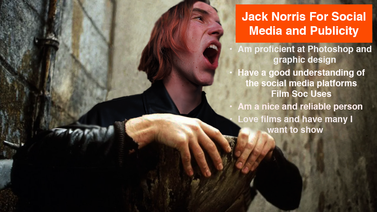 The Social Media & Publicity Secretary of the society will oversee the social media accounts of the society, ensuring graphics and posts are created for all of our screenings and that these are at a consistent time, and replying to any messages we receive. They will also be expected to take charge of our WhatsApp, giving our members regular updates.