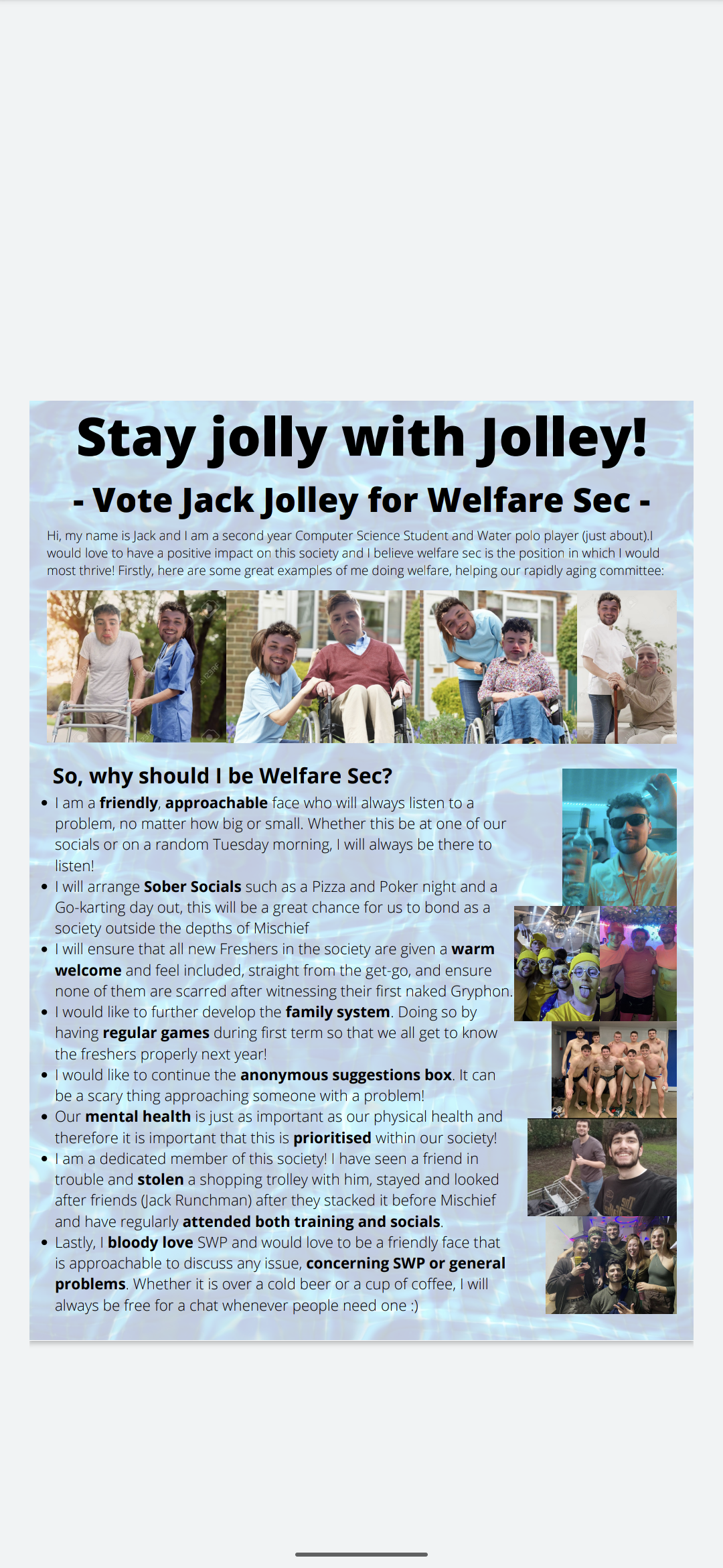Other roles that are important for welfare secretaries are assisting the social secretaries to ensure that socials cater for all members, and to help organise some sober socials throughout the year for those that do not drink for whatever reason they may have. These socials could include bowling, going to gym classes, laser quest, etc.