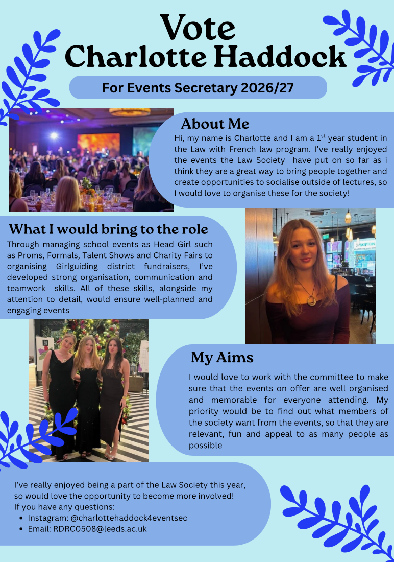 Events Secretary of the Leeds Law Society for the 2026/27 academic year. Please see responsibilities HERE