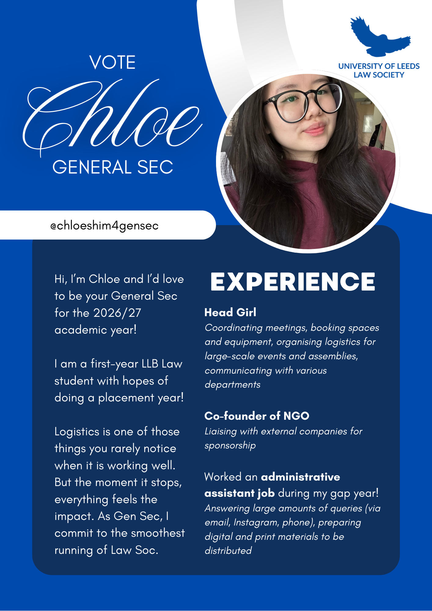 General Secretary of the Leeds Law Society for the 2026/27 academic year. Please see responsibilities HERE
