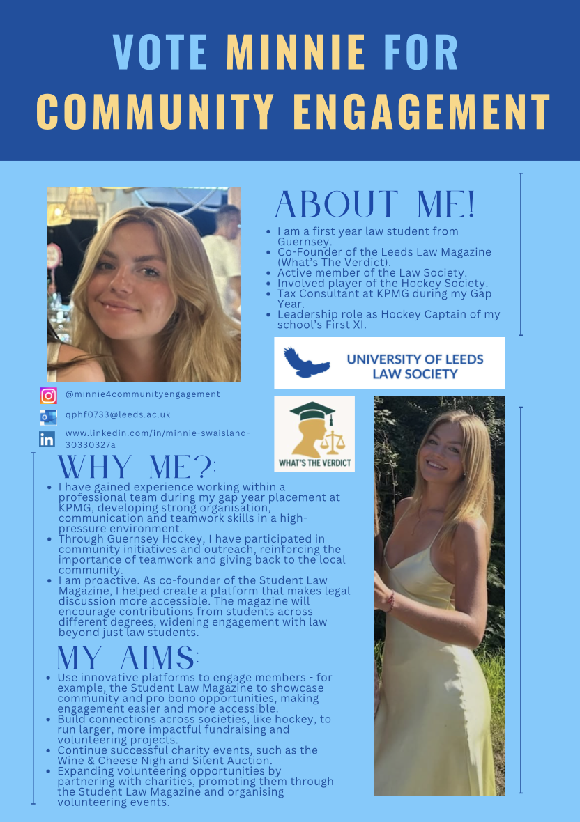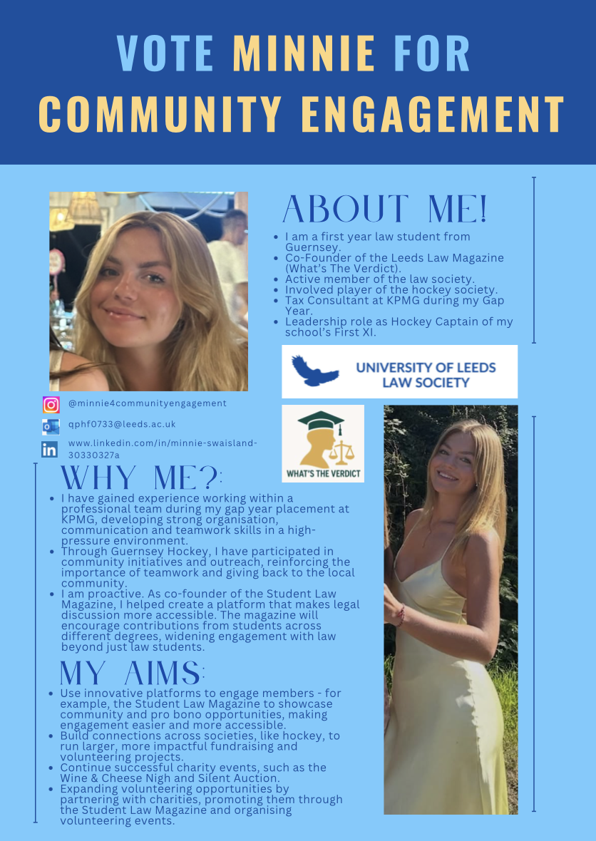 Community Engagement Secretary of the Leeds Law Society for the 2026/27 academic year. Please see responsibilities HERE