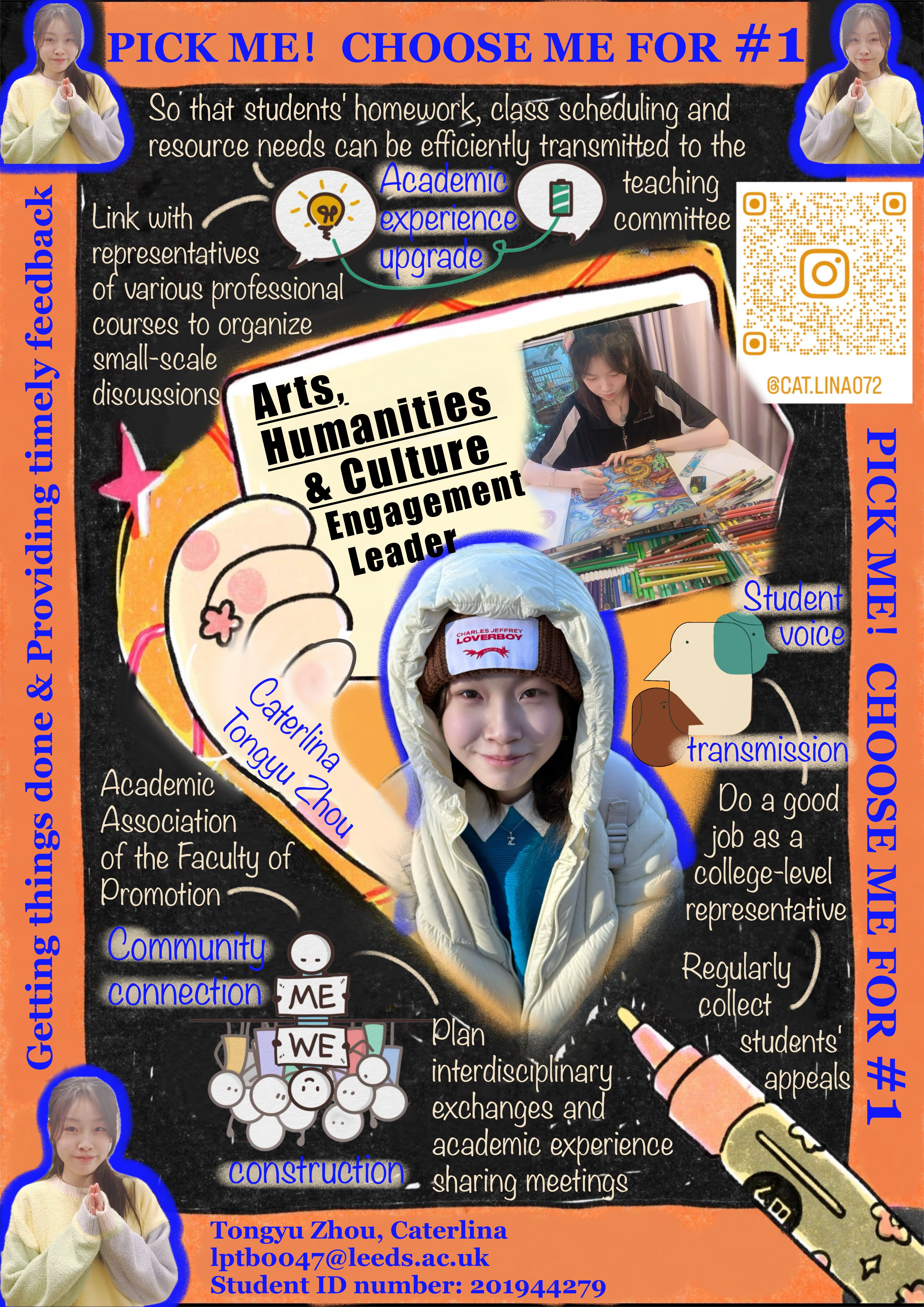 I am Tongyu Zhou, a first-year student studying Graphic and Communication Design. Having experienced the academic and social challenges of adjusting to university life as a new student, I want to serve as an Engagement Leader, speak up for students in our faculty, and build stronger connections—living out LUU’s values of inclusivity and empowerment.