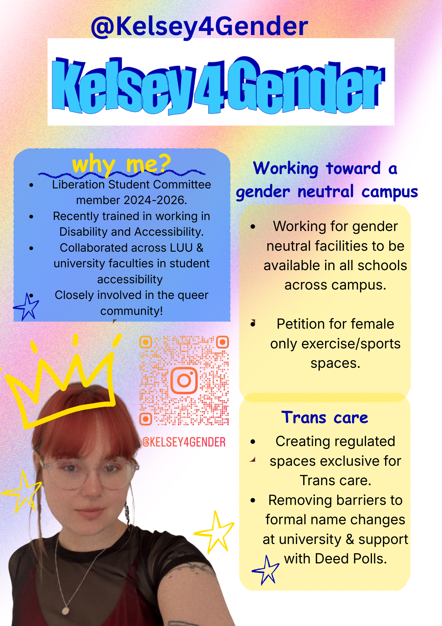 As a female presenting queer student, I have experienced unfairness and ignorance to safety on campus. I want to feel like I am safe here, and I want that for the other 40,000 students that study here. Whether this be in the form of arranged groups for students to support each other, or a full redesign of our current support system. My goal with this role is to make LUU and the wider university community a more mindful place for us all.