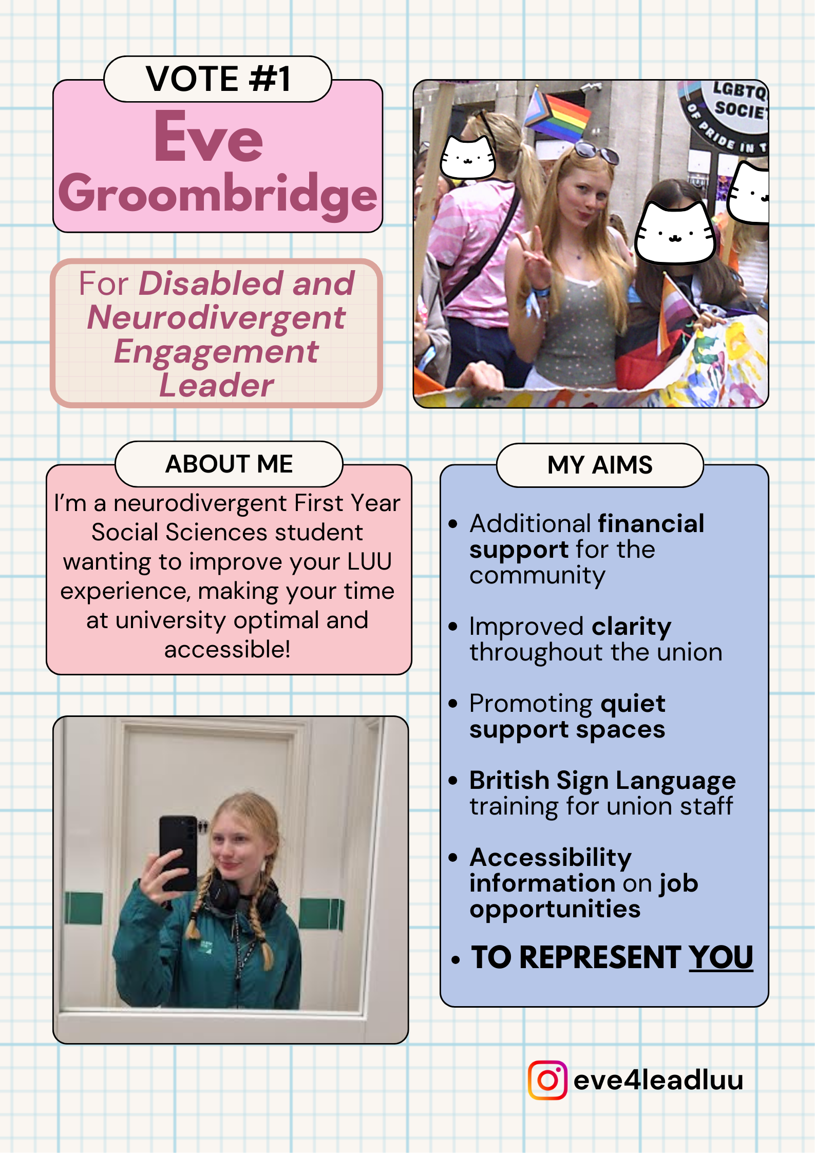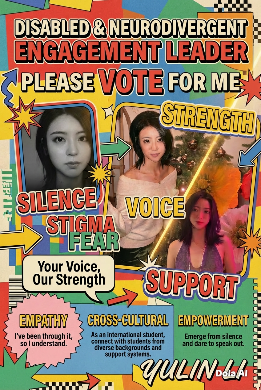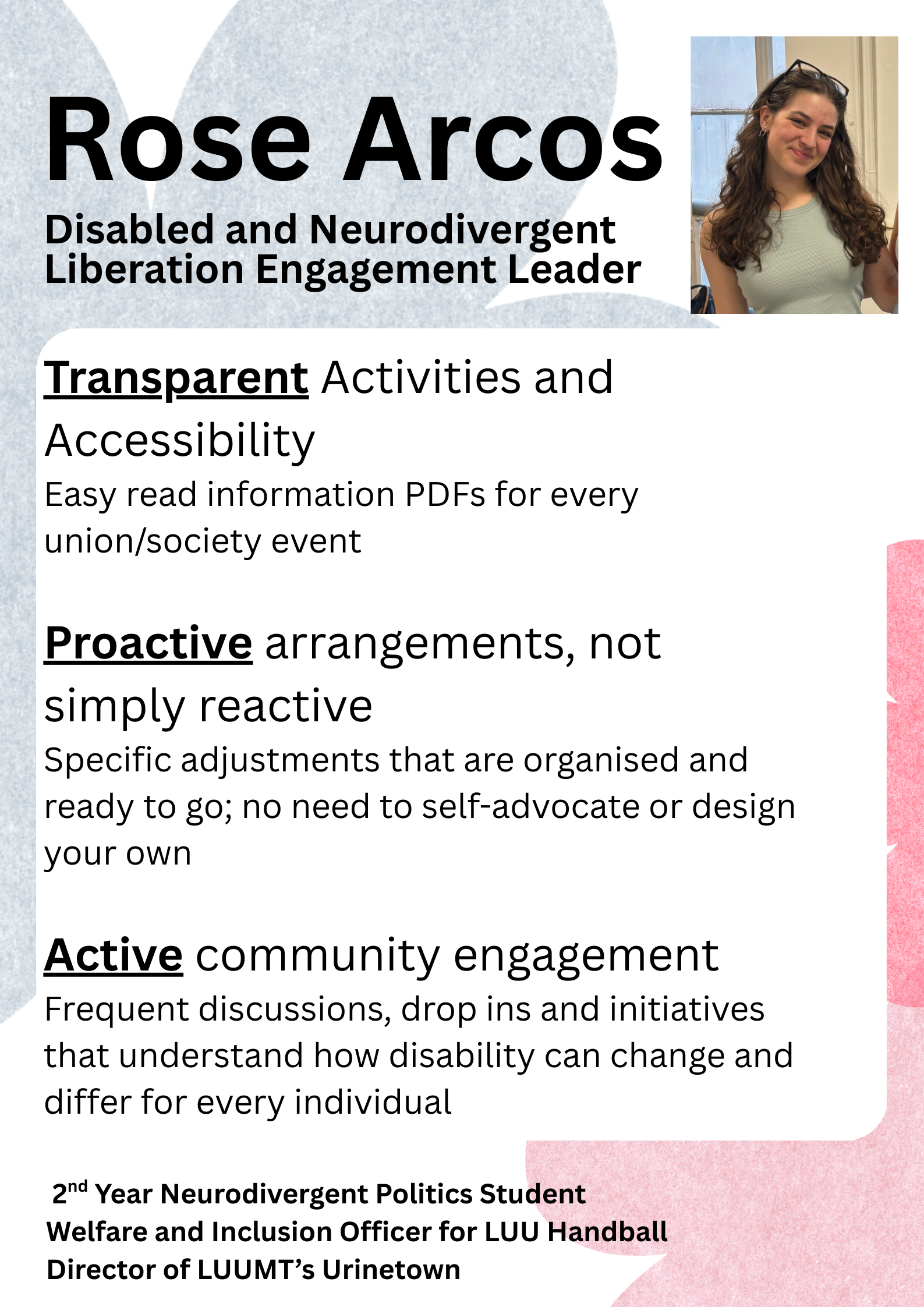 Frequent discussions, drop ins and initiatives to facilitate support, celebration and change. The experience of disability is different for every individual and is often constantly changing. I will be completely committed to hearing, understanding and uplifting all voices and experiences within our disabled and neurodivergent community. Through weekly drop ins and monthly discussions, I will nurture conversation and ensure I’m fully informed with the real experiences in our union so I can truly represent our community and fight for what matters most to its members. Additionally, I will organise further initiatives to advance awareness around key issues in university life and to celebrate our incredible community. It’s important to not just focus on our struggles but all the joy, resilience and creativity our community has too. I strive to keep this at the centre of my work and be driven by my love for the union and our community, not resentment and hatred.