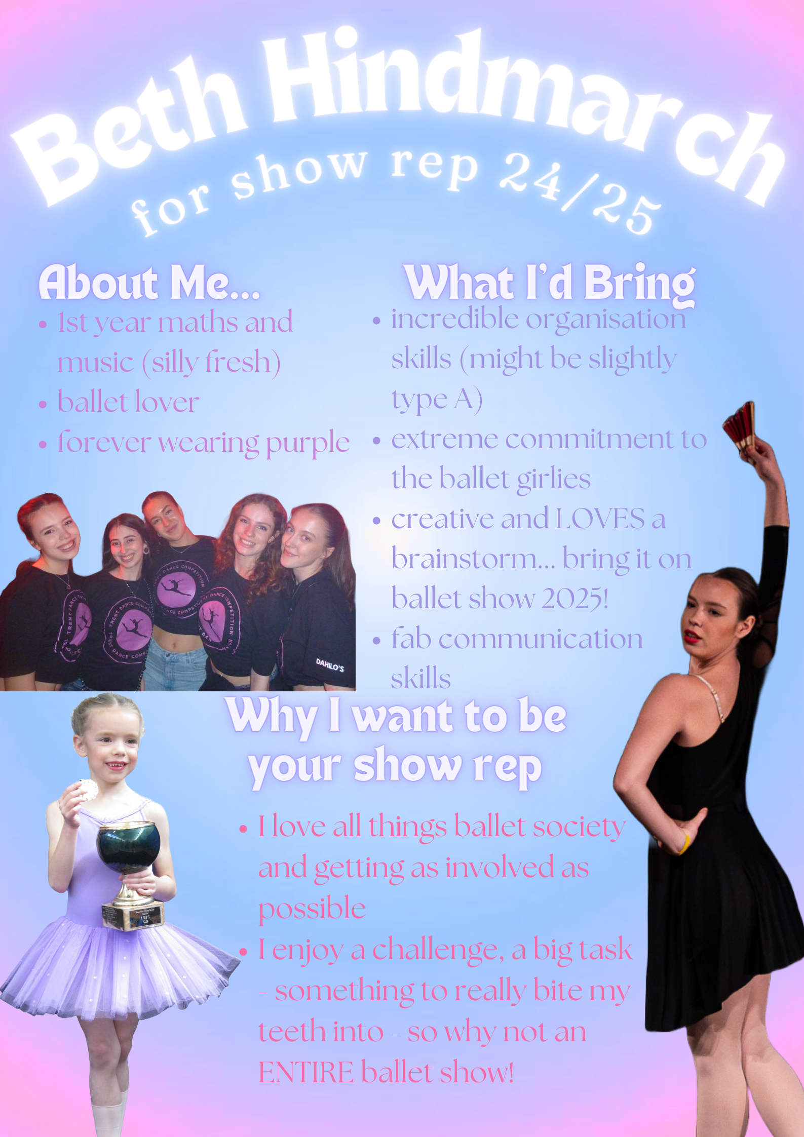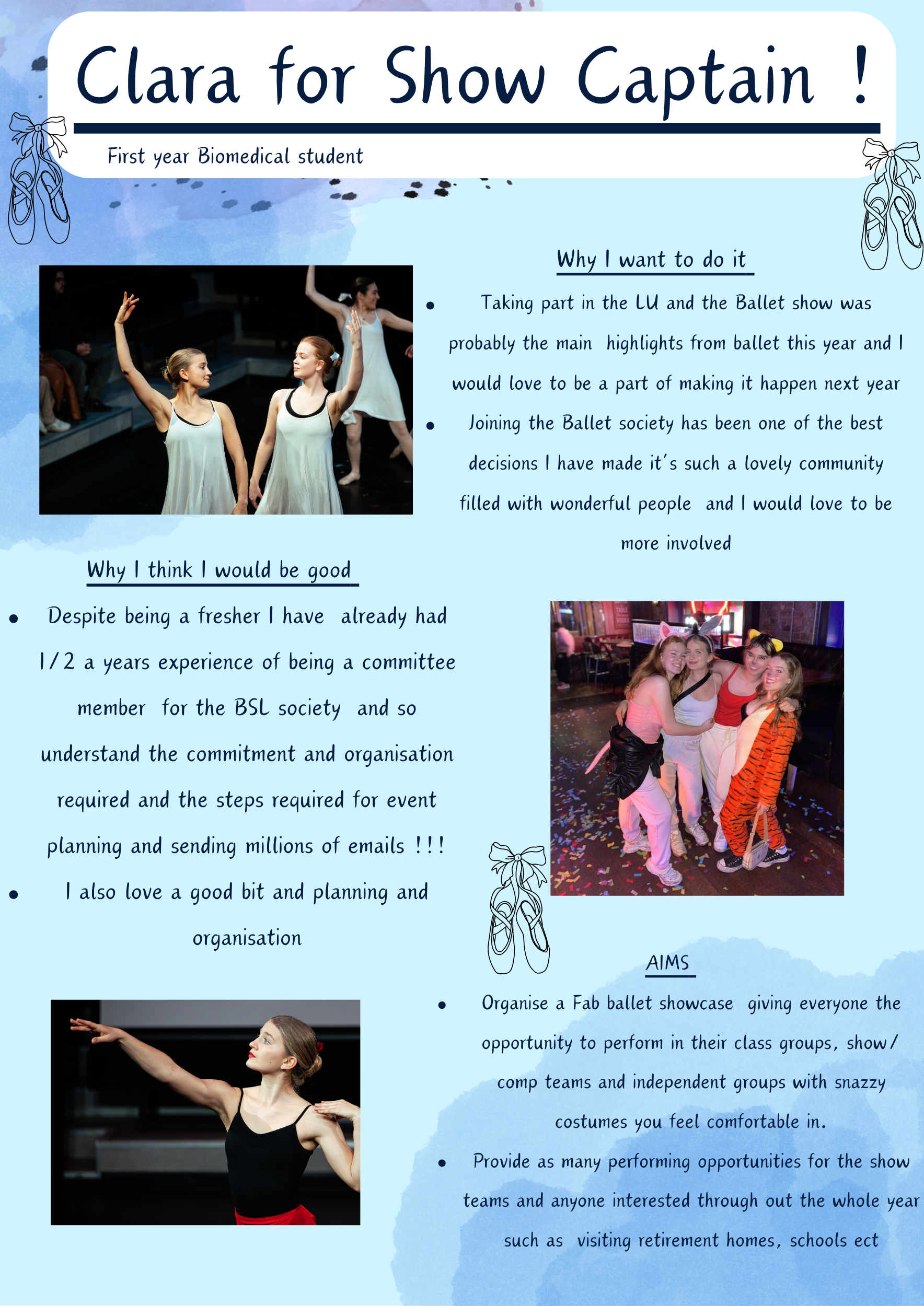 - In charge of our Annual Ballet Show: creating a theme, booking a venue, communicating with teachers, promoting, etc.