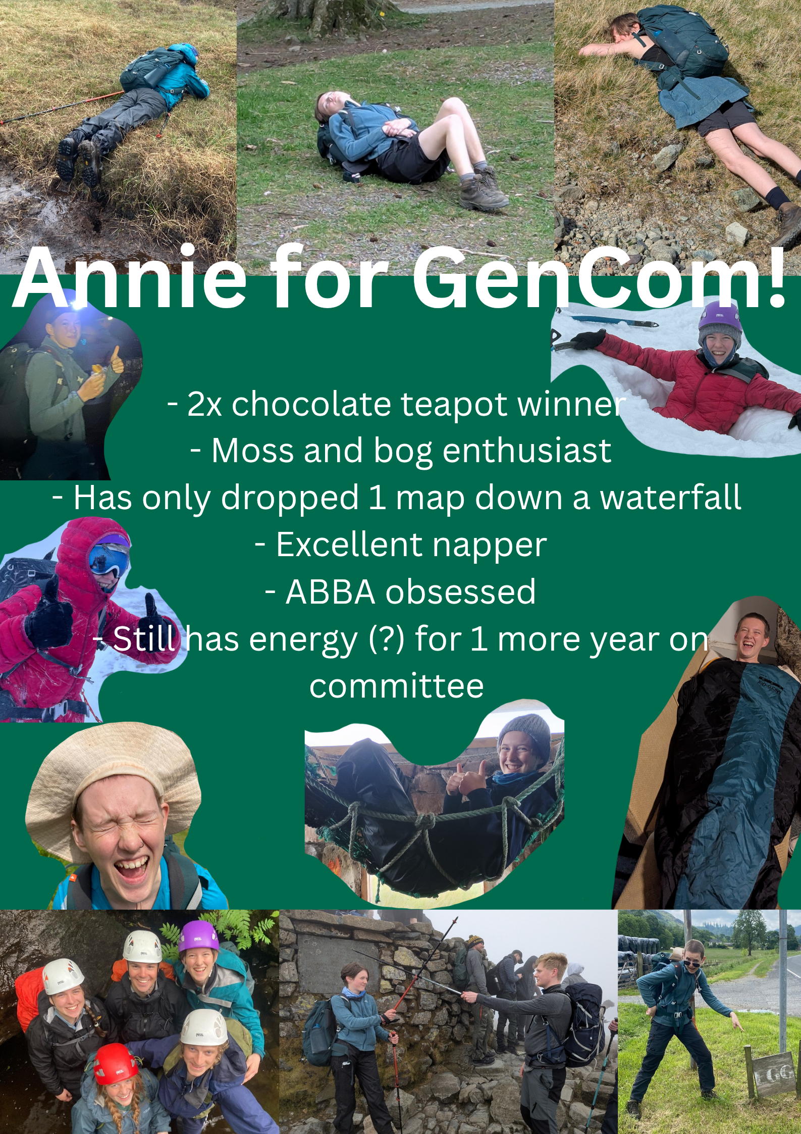 Gen Com will also be expected to help out with admin tasks as and when required and anything else the rest of the committee may need help with. It may help if you have experience of being on a committee before or if you have a lot of hiking experience as this role often has an advisory element to it.