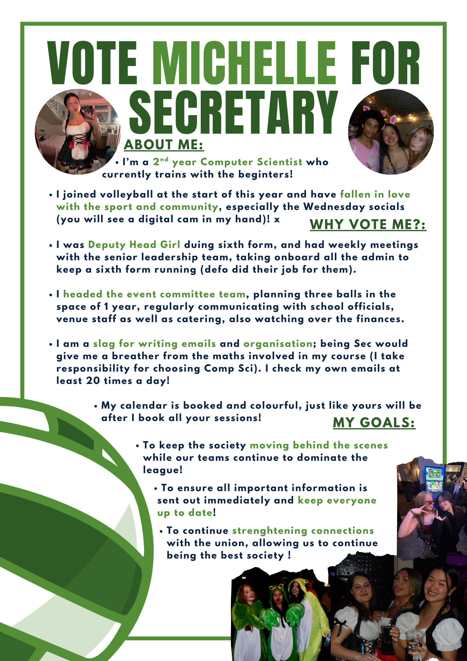 The secretary role has taught me the importance of communication and how it literally keeps things running. It requires an individual dedicated to society with communication and time management skills. I thought I was decent in these areas prior to my role but can only see how much I’ve grown since I was elected this time last year. A willingness to learn is part of the process and the role because you will make mistakes and you will become better.