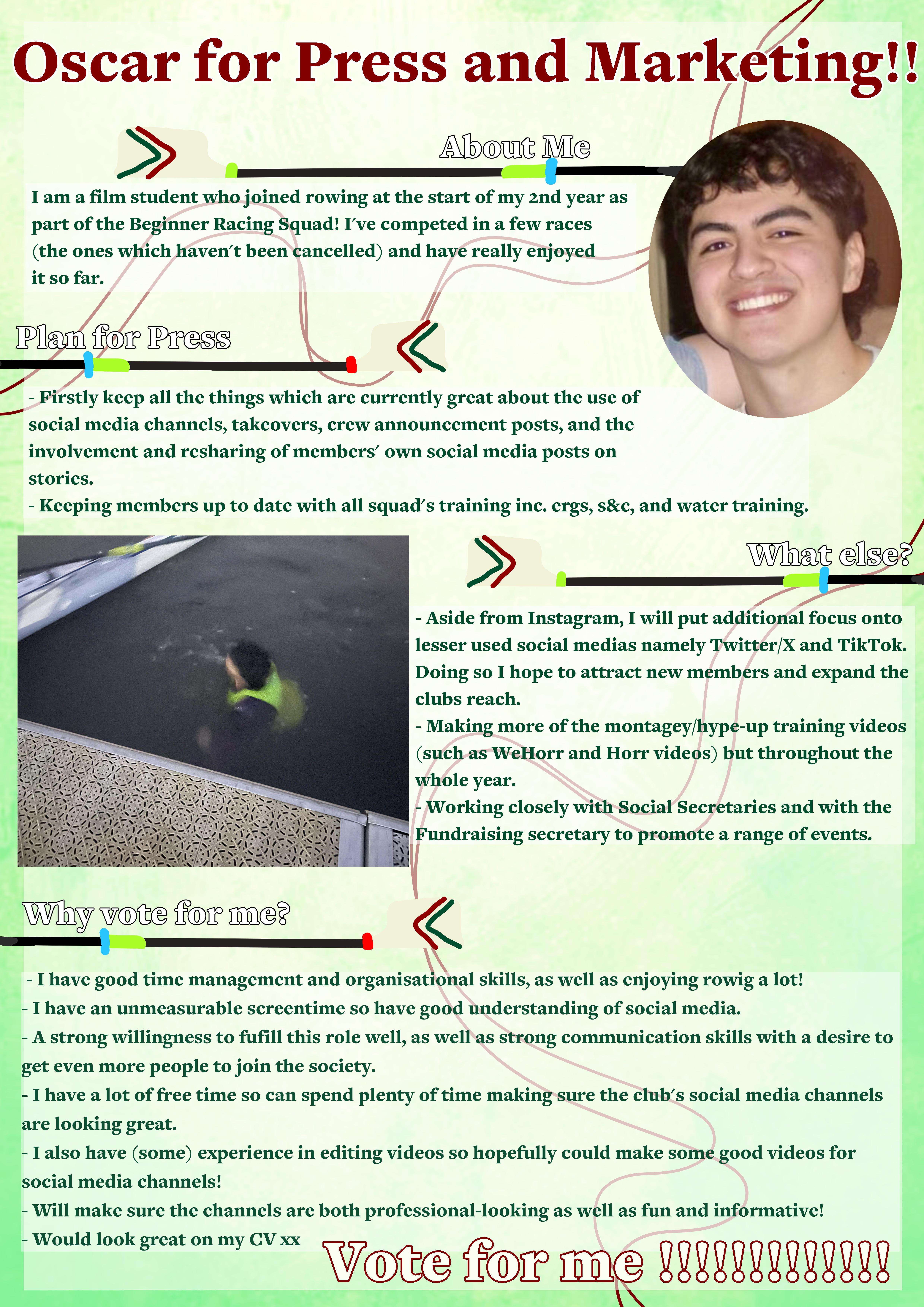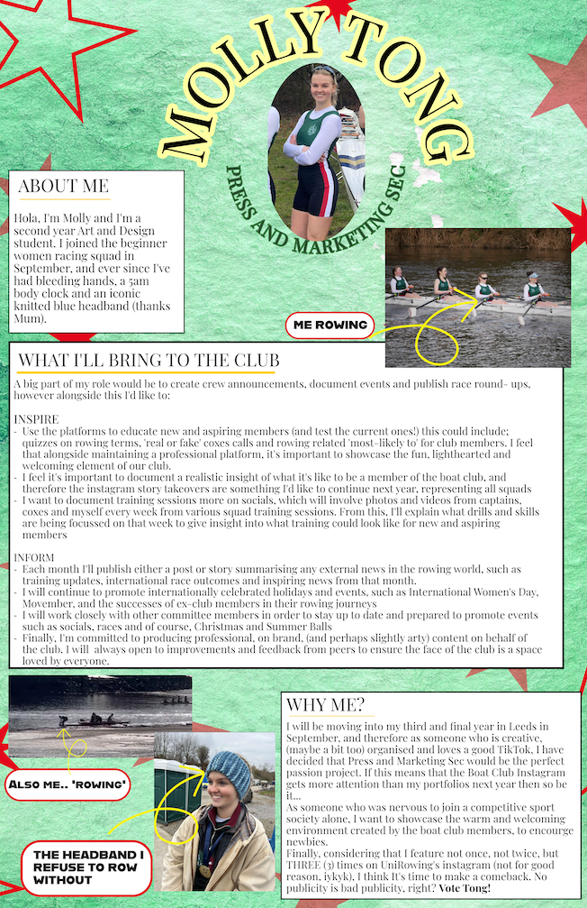 The role of press and marketing secretary involves producing and maintaining a professional and up-to-date social media presence for the club. This includes platforms such as Instagram, twitter, Facebook and TikTok as well as the clubs website. This role is important to expand the reach of the club and is especially important in gaining new members. Press and marketing secretary requires an individual who is organised, able to communicate effectively with other members of committee and has a creative flair.