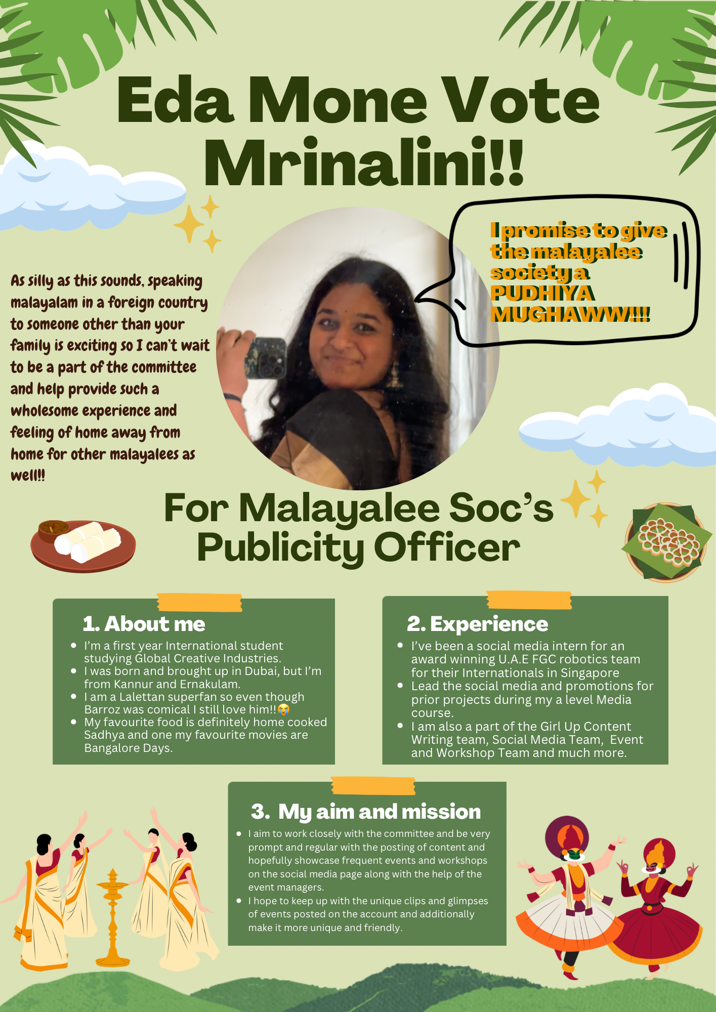 Social media secretary helps create posts to promote events and manage the instagram. This includes communicating with other societies and also monitoring the chats on Instagram and WhatsApp.