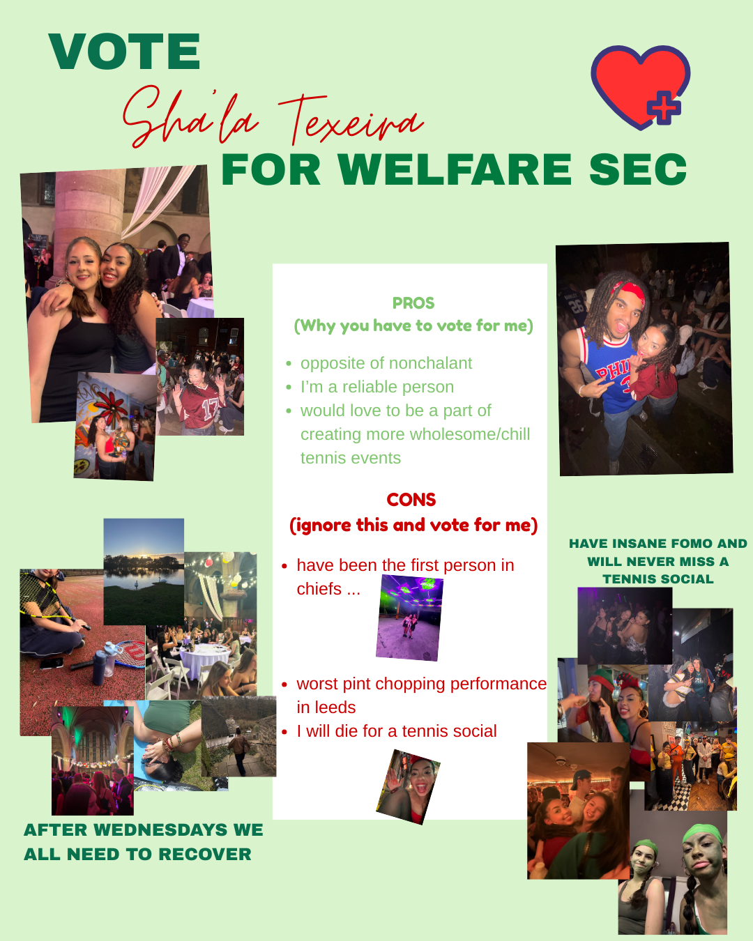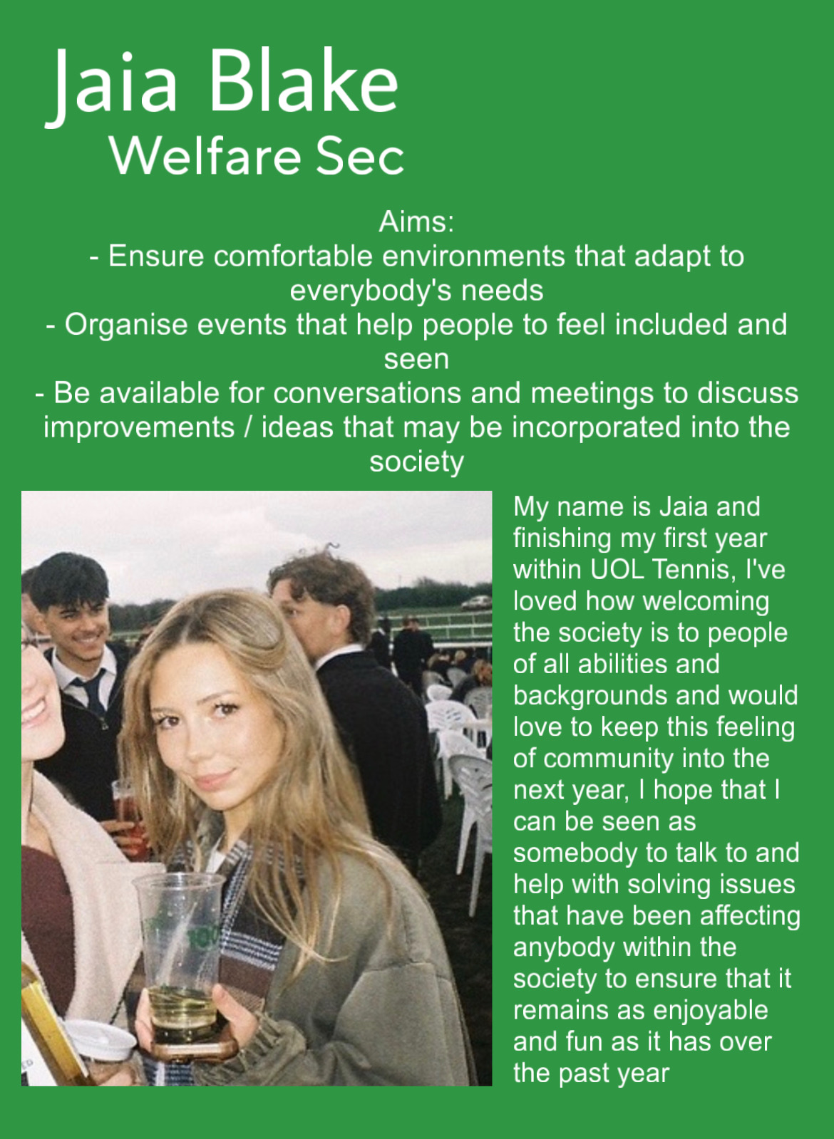 The women's welfare secretary is an individual that anyone within the society can reach out to and for support and will work closely with the men's welfare secretary to provide this support and create events that will help with this.