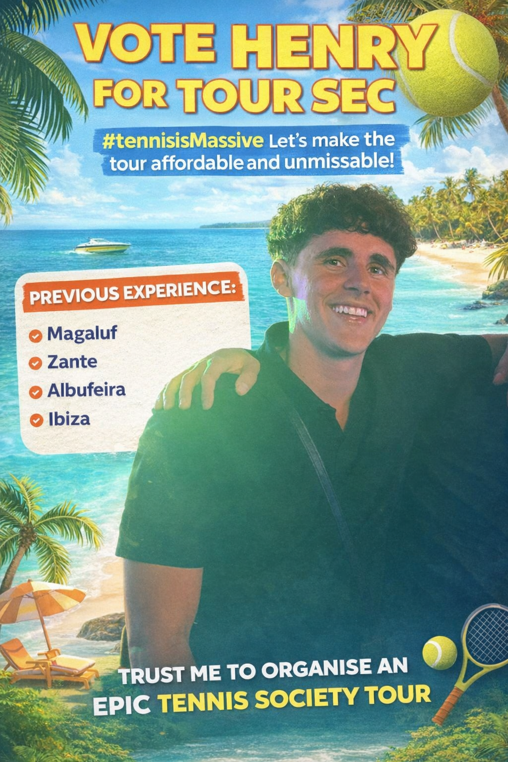 The tour secretary will organise the tennis tour which is a society trip to another country.
