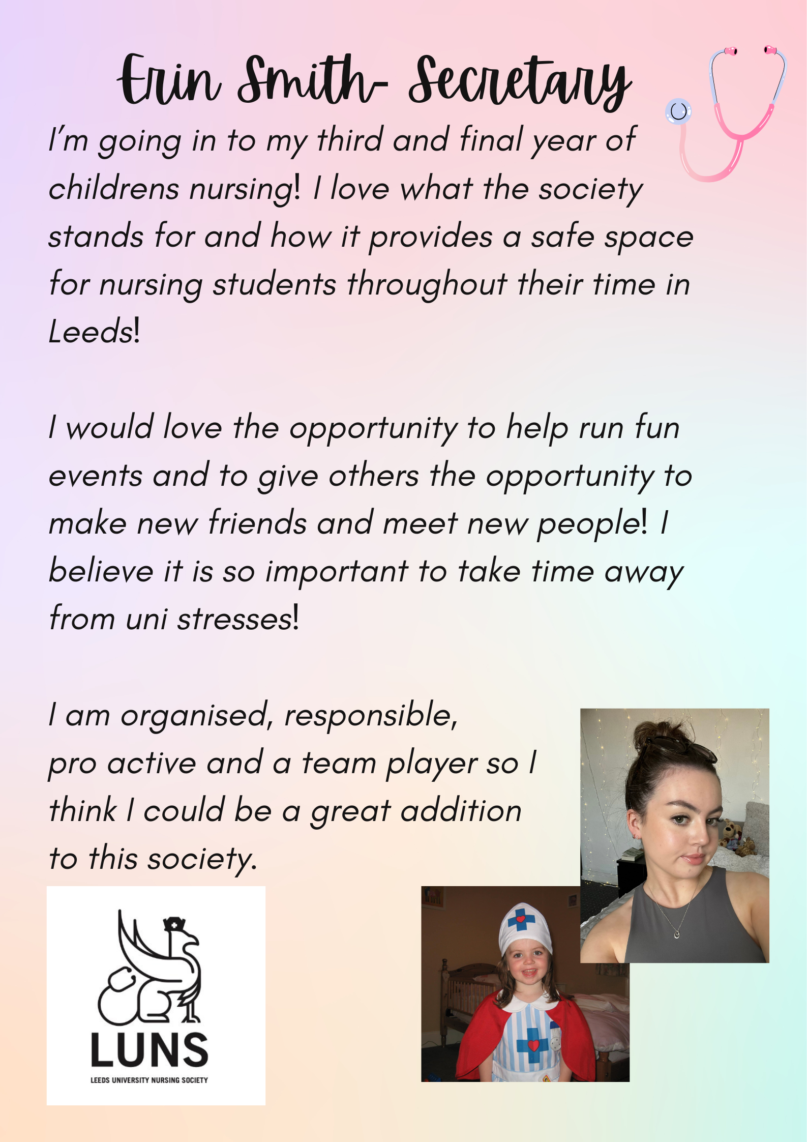 I have absolutely loved my time being on committee! I think the highlight for me is getting to know all our future nurses and how amazing they are! I have really enjoyed working with them, supporting them and having lots of fun and celebrating with them! A nursing degree is really hard and I feel this role really gave me an opportunity to support fellow student nurses and give them a bit of a boost if they’re struggling. The other area I have absolutely loved is all the charity things we have done, Emily and myself got the opportunity to do Leeds Big Sleep which was absolutely incredible and I can’t believe how much money we raised for that event (over £500) and other charitable events we have done too! Being on the committee can take up quite a bit of your time at some points however if you’re organised and can juggle your work a bit, it is absolutely worth applying! I can honeslty say you won’t regret it 🩷