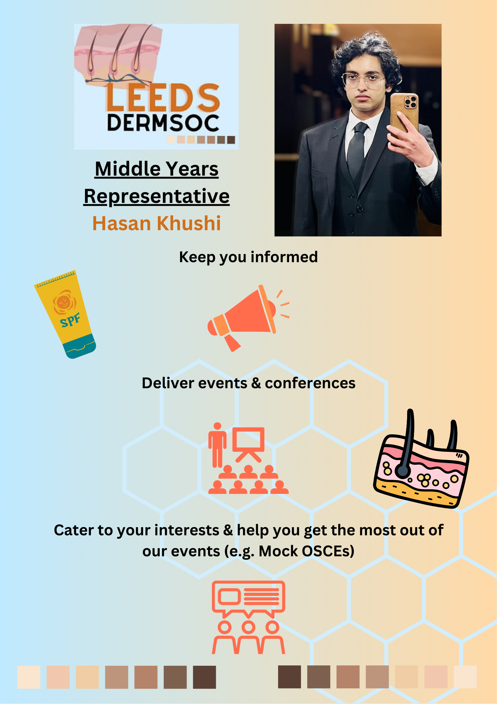 The Middle Years Rep promotes events to 3rd Year and intercalating students. They must be active in relevant group chats, available for queries, and assist with event organisation, representing a diverse student body.