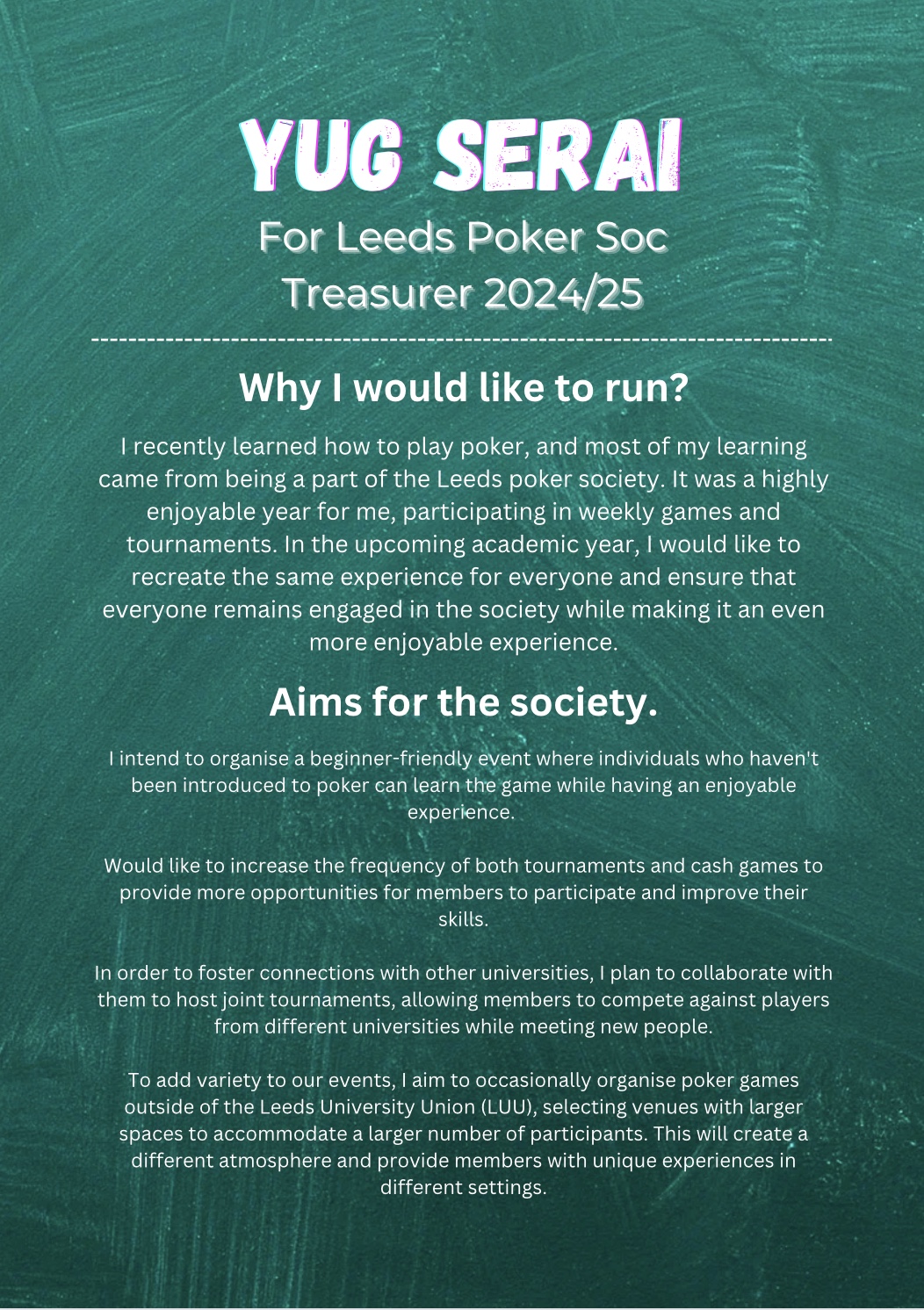 - Only active members of Leeds University Union Poker Society can vote in this election
