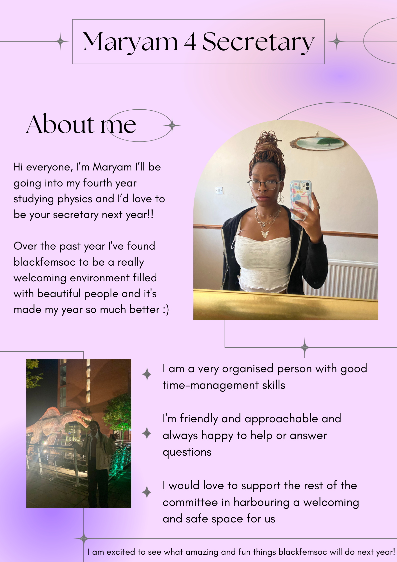 This position would require overseeing and managing the administrative aspects of the society. This role involves tasks such as creating pages for events and elections, maintaining all records relating to the society, including but not limited to memberships, mailing lists, collaborations, events, passwords and resources used at events. The secretary is responsible for making notes during meetings, ensuring that any administrative requirements set by the union and other relevant parties are met, the logistics of planning events, making information available when needed and responding to emails and enquires relating to the society. An ideal candidate for this role would be able to maintain records online, keep information organised and respect data protection when relevant, be able to communicate effectively, take on other roles, if necessary, have some knowledge of how to navigate the websites we use and solve problems on their feet.