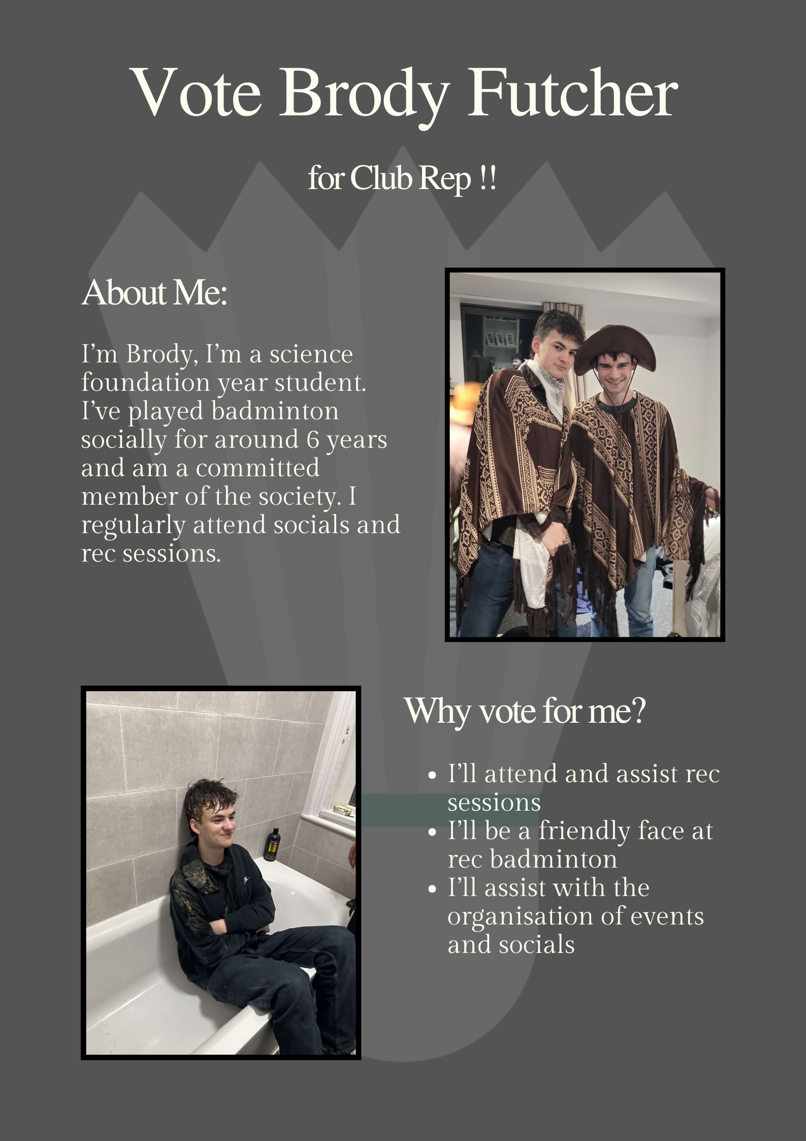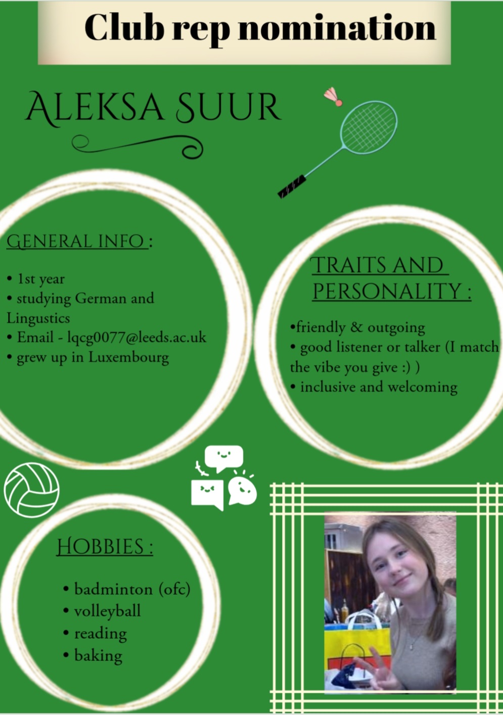 - Be a friendly face at rec badmitnon for club members to speak to