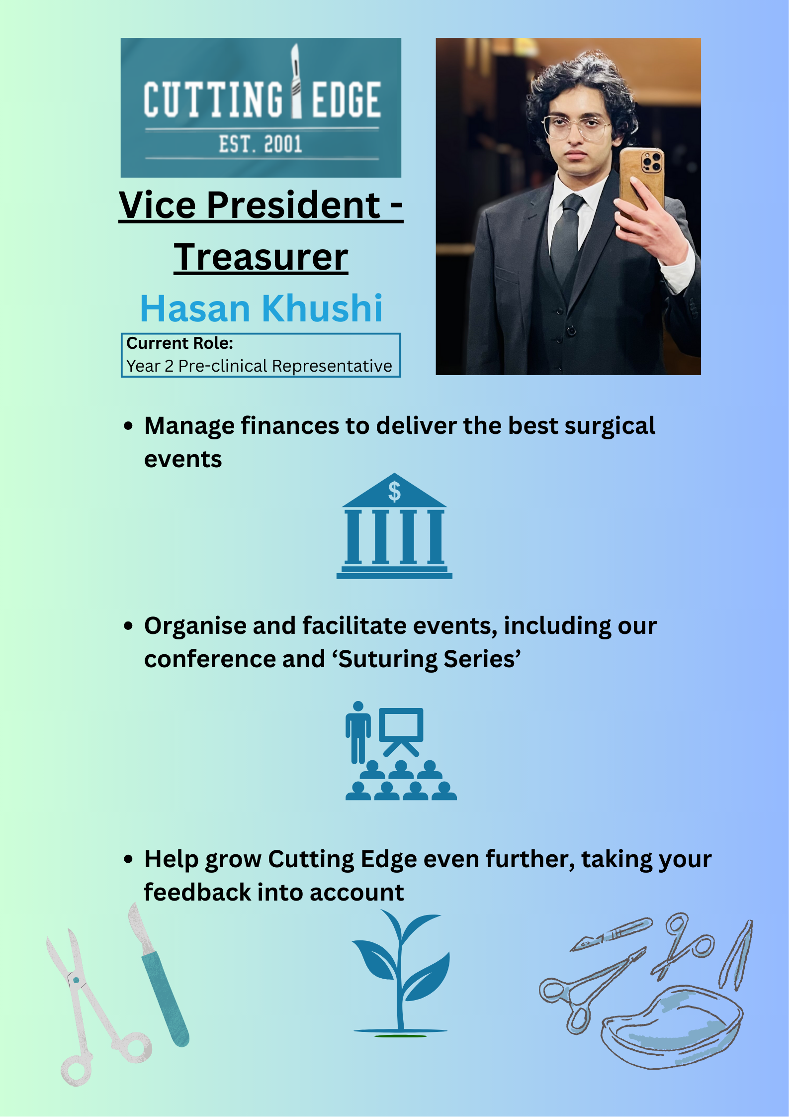 The Vice President - Treasurer is responsible for the finances of the society. with 250+ active members, it is imperative they have an understanding of where funds can be allocated to ensure our output is successful. This is a leadership responsibility and directly oversees the committee members who plan events, conferences, and workshops therefore they should have a sound understanding of how we can deliver initiatives effectively. They will make sponsorship enquiries with medical organisations to create fuding streams for our events and conferences. They will be committed to increasing our membership-base and providing tangible benefit to becoming a member of the society.