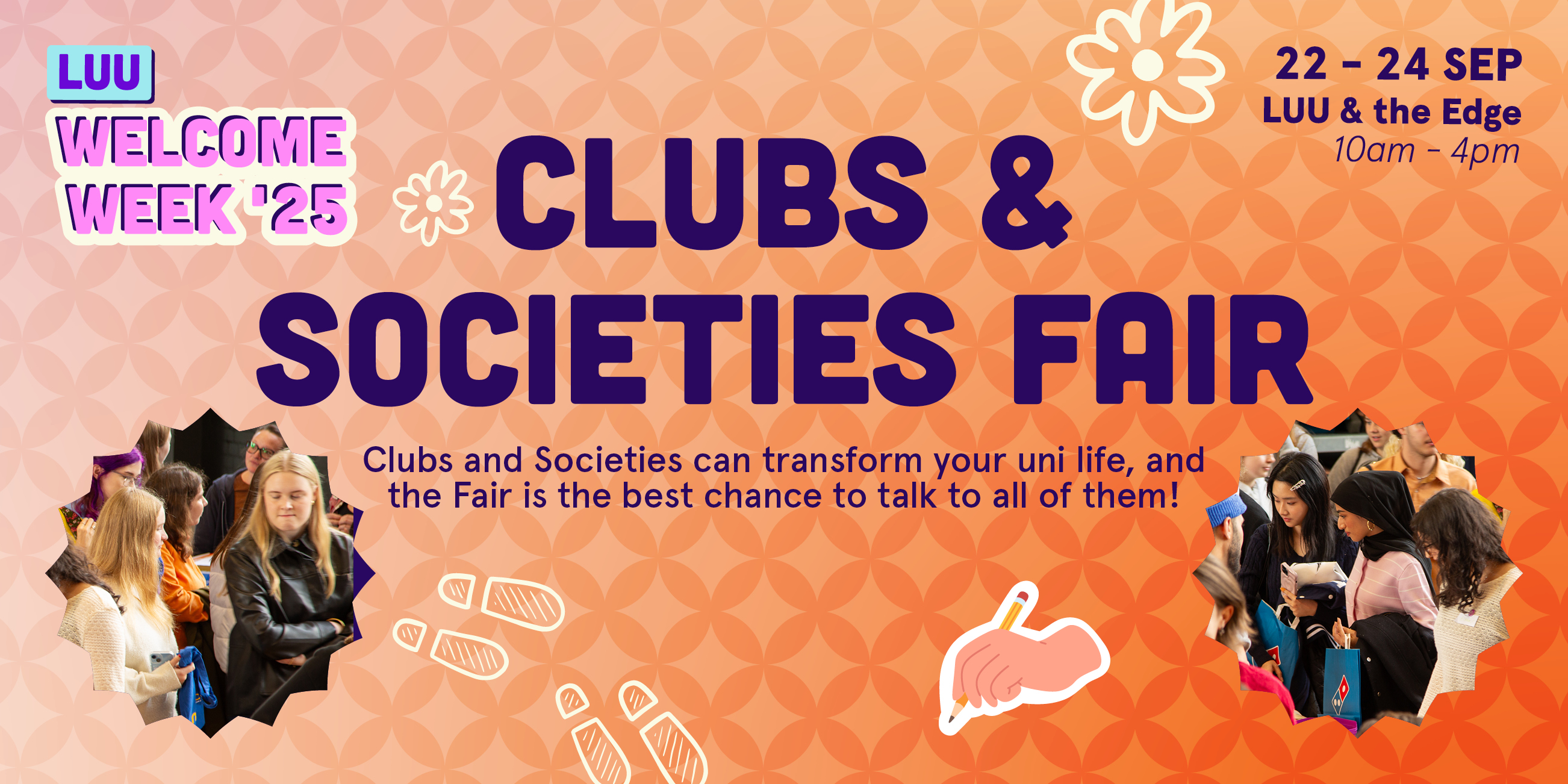 The Clubs and Societies Fair is your chance to meet all of our 350+ clubs & societies, as well as brands, and find out all the ways you can get involved and make the most out of your time at Leeds. It is the flagship event of Welcome and not one to miss! You'll leave the Fairs having signed up to attend a Give it a Go, joined a society, and enjoyed some free pizza!