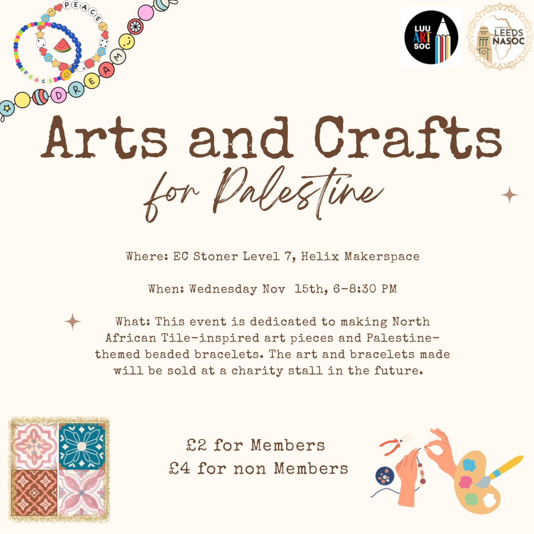 The North African Society and Leeds Art Society are collaborating to bring together an Arts and Crafts Night for Palestine.