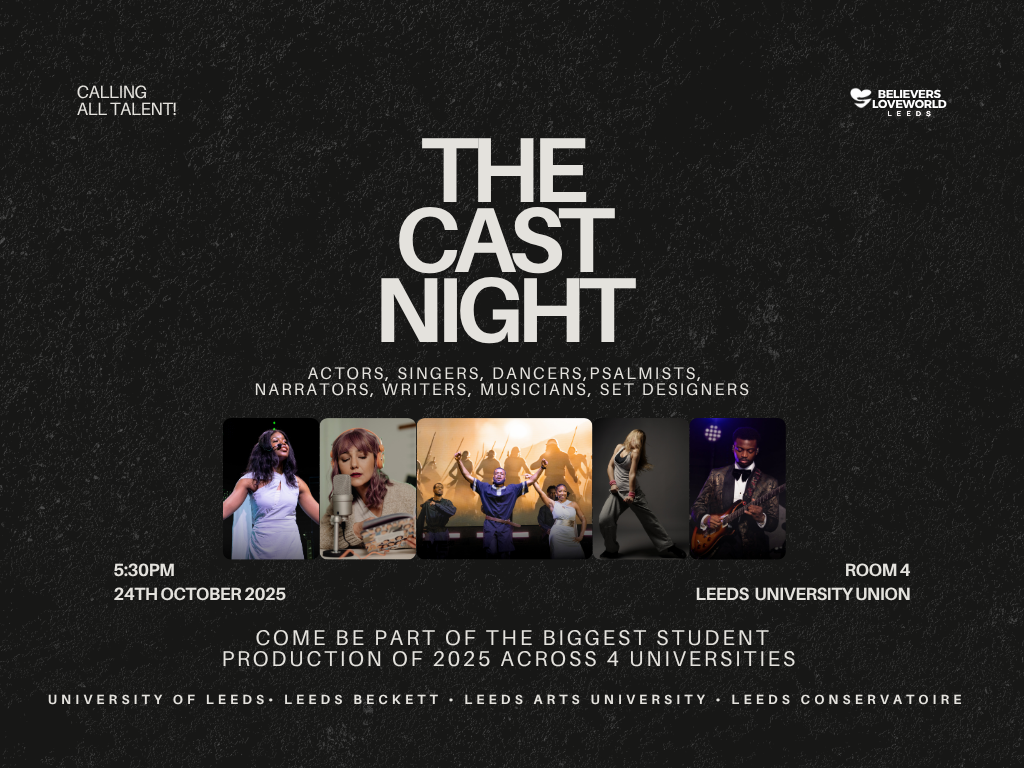 Join Believers Loveworld Society for The Cast Night, a citywide casting call to build the live production: Who Is Jesus? The Christmas Special that will be performed in the last week of November. Our vision is simple and urgent: to show who Jesus truly is through creative arts on campus. We are gathering gifts from across Leeds to create an excellent, faith-filled production that welcomes students and friends.