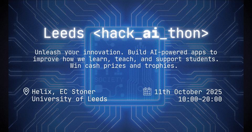 Join Leeds <hack_ai_thon>, a one‑day, on‑campus hackathon where University of Leeds students design and build AI‑powered applications that improve learning, teaching, and student wellbeing. No need to be an AI expert—bring an idea, form a team, use API, fine-tune your model or use no-code tools, ship a useful AI-powered solution and get a chance to win prize money and trophies!!