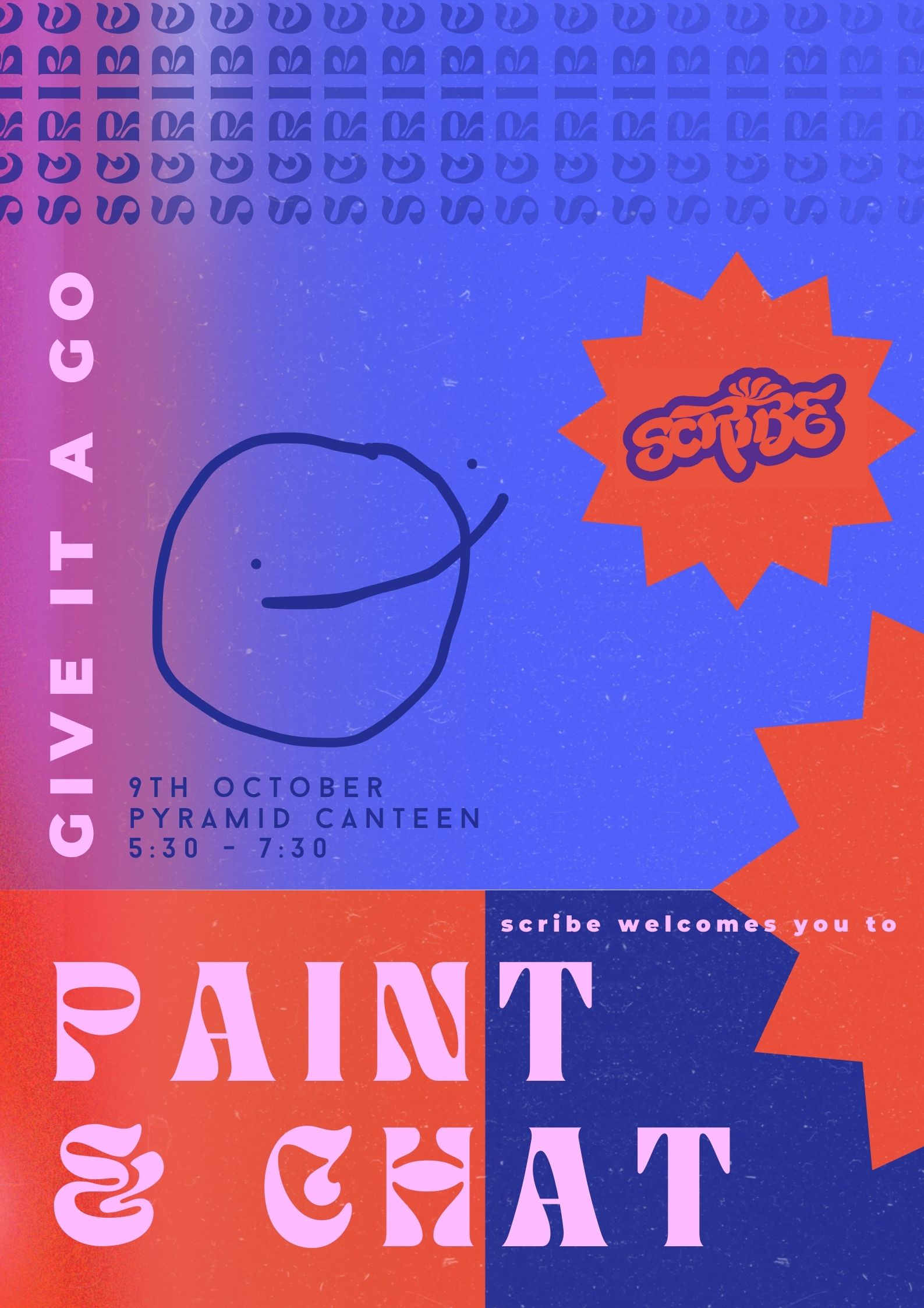 Welcome to Scribe! Our GIAG is a chance for artists of any level and confidence to get together and create something collaborative! We will be providing groups with painting supplies so just bring your brilliant conversation skills.