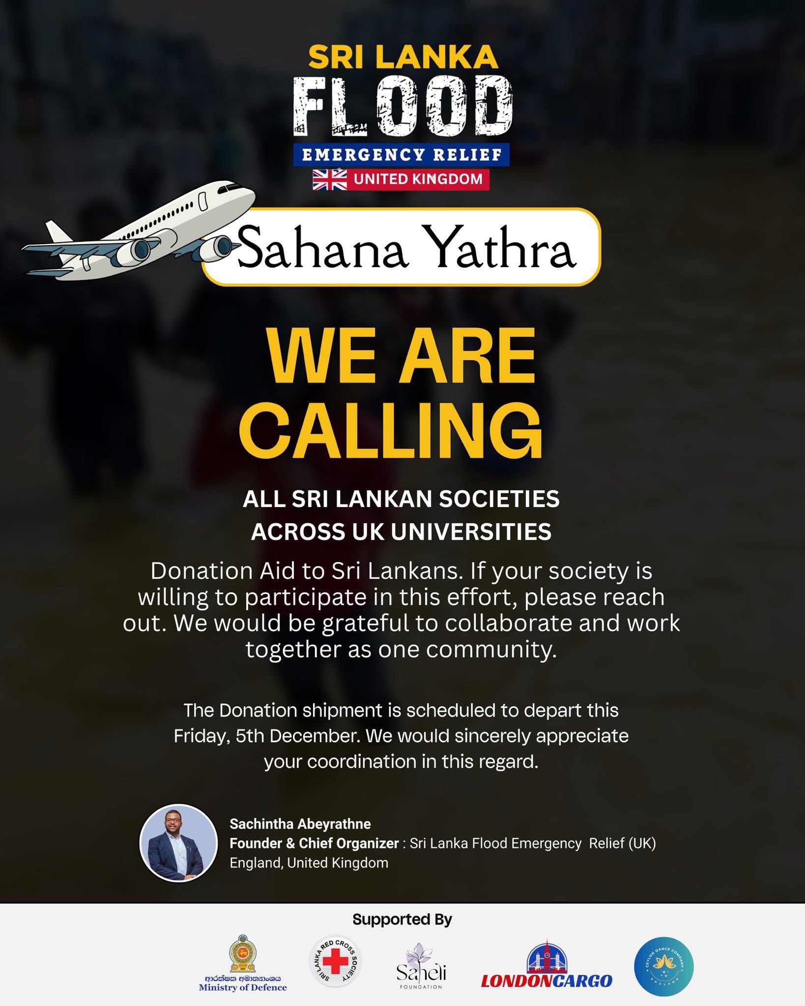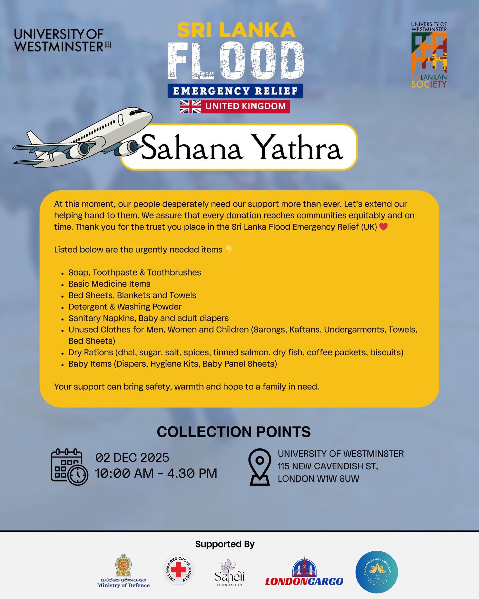 Donate to the Sahana Yathra Aid program organised in collaboration with Sri Lankan Societies across the UK to help Sri Lankans affected by Cyclone Ditwah.