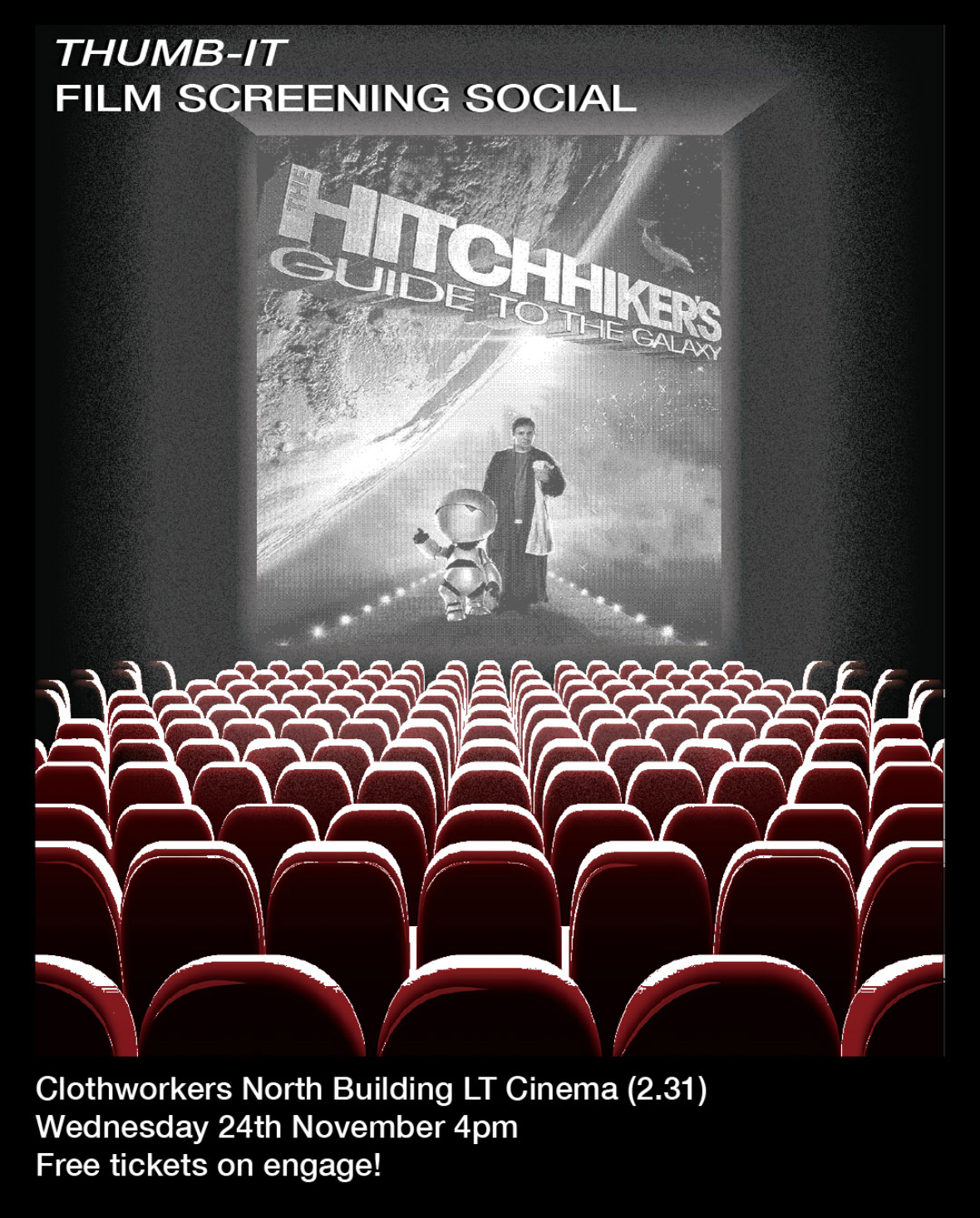 Come and watch The Hitchhiker’s Guide to the Galaxy with us in Clothworkers North Building LT Cinema on Wednesday (26/11) @4pm !!