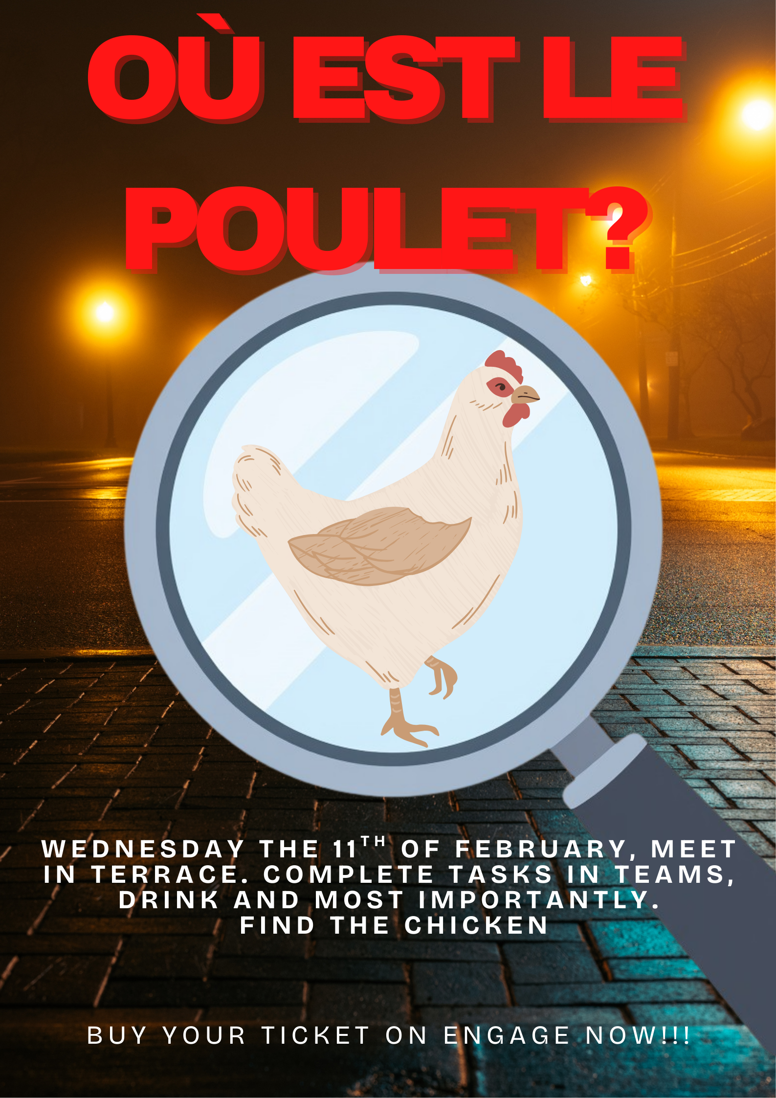 A committee member, le poulet, will hide in a pub in Leeds and in teams you will compete to find them, completing tasks and drinking in order to find the chicken and get the prize money!